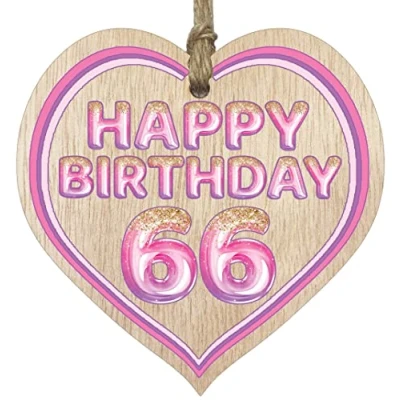 MAKE THEM SMILE WITH THIS BEAUTIFUL GIFT: This exceptional quality heart shaped wooden plaque shows the design: "Happy Birthday 66". If you are looking for funny thinking of you gifts for friends then then this hanging wooden heart is bound to make them smile. Not just for a women's 66th birthday presents also for men 66th birthday gifts for women friend. EVERY HEART IS TRUELY UNIQUE: Unlike other brands our beautiful plaques are made from raw wood and not a laminated MDF. This means that every single heart will have it's own pattern and indentation from the grain of the wood used. Each heart is hand finished with a lacquer varnish that really accentuates the the deep colour of the wood and also makes the ink of the pattern/text clearer and brighter in colour. WHAT DO YOU GET: This thoughtful presents for women is made from the highest quality wooden signs and plaques. Incredibly sweet cheer up positivity keepsake gifts for women and men from Stuff4 Ltd. MADE AND QUALITY CHECKED IN THE UK: We manufacture all our product right her in the UK so you can be sure of a fast turnaround and a product that is expertly made - mental health gifts, special friend gifts, miss you gifts for friends, positive gifts for women and birthday gifts for her or him. EASY TO HANG: The hanging wooden heart plaque comes equipped with a small jute twine, which can be then used to hang it on somewhere for decoration. The wooden sign is convenient for you to assemble without spending too much effort and time.