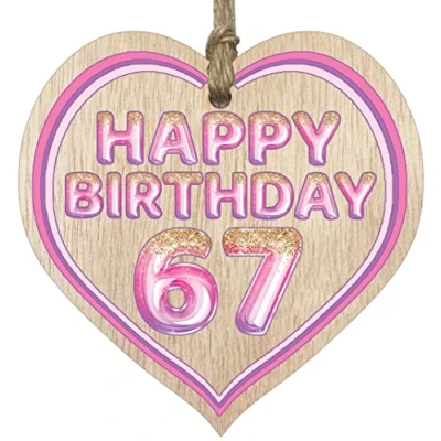 MAKE THEM SMILE WITH THIS BEAUTIFUL GIFT: This exceptional quality heart shaped wooden plaque shows the design: "Happy Birthday 67". If you are looking for funny thinking of you gifts for friends then then this hanging wooden heart is bound to make them smile. Not just for a women's 67th birthday presents also for men 67th birthday gifts for women friend. EVERY HEART IS TRUELY UNIQUE: Unlike other brands our beautiful plaques are made from raw wood and not a laminated MDF. This means that every single heart will have it's own pattern and indentation from the grain of the wood used. Each heart is hand finished with a lacquer varnish that really accentuates the the deep colour of the wood and also makes the ink of the pattern/text clearer and brighter in colour. WHAT DO YOU GET: This thoughtful presents for women is made from the highest quality wooden signs and plaques. Incredibly sweet cheer up positivity keepsake gifts for women and men from Stuff4 Ltd. MADE AND QUALITY CHECKED IN THE UK: We manufacture all our product right her in the UK so you can be sure of a fast turnaround and a product that is expertly made - mental health gifts, special friend gifts, miss you gifts for friends, positive gifts for women and birthday gifts for her or him. EASY TO HANG: The hanging wooden heart plaque comes equipped with a small jute twine, which can be then used to hang it on somewhere for decoration. The wooden sign is convenient for you to assemble without spending too much effort and time.