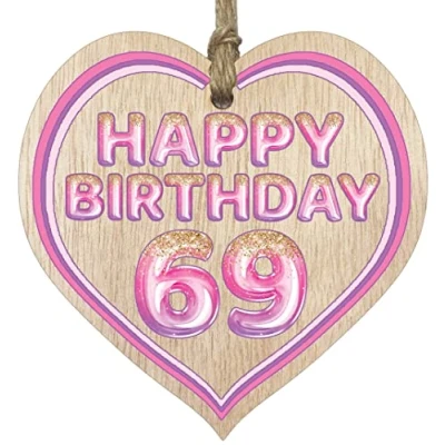 MAKE THEM SMILE WITH THIS BEAUTIFUL GIFT: This exceptional quality heart shaped wooden plaque shows the design: "Happy Birthday 69". If you are looking for funny thinking of you gifts for friends then then this hanging wooden heart is bound to make them smile. Not just for a women's 69th birthday presents also for men 69th birthday gifts for women friend. EVERY HEART IS TRUELY UNIQUE: Unlike other brands our beautiful plaques are made from raw wood and not a laminated MDF. This means that every single heart will have it's own pattern and indentation from the grain of the wood used. Each heart is hand finished with a lacquer varnish that really accentuates the the deep colour of the wood and also makes the ink of the pattern/text clearer and brighter in colour. WHAT DO YOU GET: This thoughtful presents for women is made from the highest quality wooden signs and plaques. Incredibly sweet cheer up positivity keepsake gifts for women and men from Stuff4 Ltd. MADE AND QUALITY CHECKED IN THE UK: We manufacture all our product right her in the UK so you can be sure of a fast turnaround and a product that is expertly made - mental health gifts, special friend gifts, miss you gifts for friends, positive gifts for women and birthday gifts for her or him. EASY TO HANG: The hanging wooden heart plaque comes equipped with a small jute twine, which can be then used to hang it on somewhere for decoration. The wooden sign is convenient for you to assemble without spending too much effort and time.