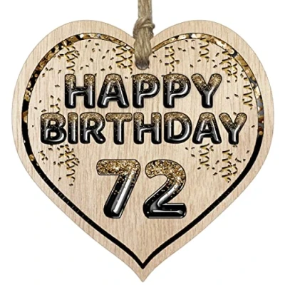 MAKE THEM SMILE WITH THIS BEAUTIFUL GIFT: This exceptional quality heart shaped wooden plaque shows the design: "Happy Birthday 72". If you are looking for funny thinking of you gifts for friends then then this hanging wooden heart is bound to make them smile. Not just for a women's 72nd birthday presents also for men 72nd birthday gifts for women friend. EVERY HEART IS TRUELY UNIQUE: Unlike other brands our beautiful plaques are made from raw wood and not a laminated MDF. This means that every single heart will have it's own pattern and indentation from the grain of the wood used. Each heart is hand finished with a lacquer varnish that really accentuates the the deep colour of the wood and also makes the ink of the pattern/text clearer and brighter in colour. WHAT DO YOU GET: This thoughtful presents for women is made from the highest quality wooden signs and plaques. Incredibly sweet cheer up positivity keepsake gifts for women and men from Stuff4 Ltd. MADE AND QUALITY CHECKED IN THE UK: We manufacture all our product right her in the UK so you can be sure of a fast turnaround and a product that is expertly made - mental health gifts, special friend gifts, miss you gifts for friends, positive gifts for women and birthday gifts for her or him. EASY TO HANG: The hanging wooden heart plaque comes equipped with a small jute twine, which can be then used to hang it on somewhere for decoration. The wooden sign is convenient for you to assemble without spending too much effort and time.