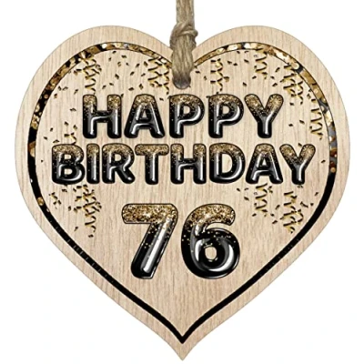 MAKE THEM SMILE WITH THIS BEAUTIFUL GIFT: This exceptional quality heart shaped wooden plaque shows the design: "Happy Birthday 76". If you are looking for funny thinking of you gifts for friends then then this hanging wooden heart is bound to make them smile. Not just for a women's 76th birthday presents also for men 76th birthday gifts for women friend. EVERY HEART IS TRUELY UNIQUE: Unlike other brands our beautiful plaques are made from raw wood and not a laminated MDF. This means that every single heart will have it's own pattern and indentation from the grain of the wood used. Each heart is hand finished with a lacquer varnish that really accentuates the the deep colour of the wood and also makes the ink of the pattern/text clearer and brighter in colour. WHAT DO YOU GET: This thoughtful presents for women is made from the highest quality wooden signs and plaques. Incredibly sweet cheer up positivity keepsake gifts for women and men from Stuff4 Ltd. MADE AND QUALITY CHECKED IN THE UK: We manufacture all our product right her in the UK so you can be sure of a fast turnaround and a product that is expertly made - mental health gifts, special friend gifts, miss you gifts for friends, positive gifts for women and birthday gifts for her or him. EASY TO HANG: The hanging wooden heart plaque comes equipped with a small jute twine, which can be then used to hang it on somewhere for decoration. The wooden sign is convenient for you to assemble without spending too much effort and time.