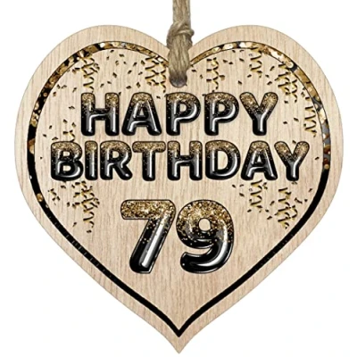 MAKE THEM SMILE WITH THIS BEAUTIFUL GIFT: This exceptional quality heart shaped wooden plaque shows the design: "Happy Birthday 79". If you are looking for funny thinking of you gifts for friends then then this hanging wooden heart is bound to make them smile. Not just for a women's 79th birthday presents also for men 79th birthday gifts for women friend. EVERY HEART IS TRUELY UNIQUE: Unlike other brands our beautiful plaques are made from raw wood and not a laminated MDF. This means that every single heart will have it's own pattern and indentation from the grain of the wood used. Each heart is hand finished with a lacquer varnish that really accentuates the the deep colour of the wood and also makes the ink of the pattern/text clearer and brighter in colour. WHAT DO YOU GET: This thoughtful presents for women is made from the highest quality wooden signs and plaques. Incredibly sweet cheer up positivity keepsake gifts for women and men from Stuff4 Ltd. MADE AND QUALITY CHECKED IN THE UK: We manufacture all our product right her in the UK so you can be sure of a fast turnaround and a product that is expertly made - mental health gifts, special friend gifts, miss you gifts for friends, positive gifts for women and birthday gifts for her or him. EASY TO HANG: The hanging wooden heart plaque comes equipped with a small jute twine, which can be then used to hang it on somewhere for decoration. The wooden sign is convenient for you to assemble without spending too much effort and time.