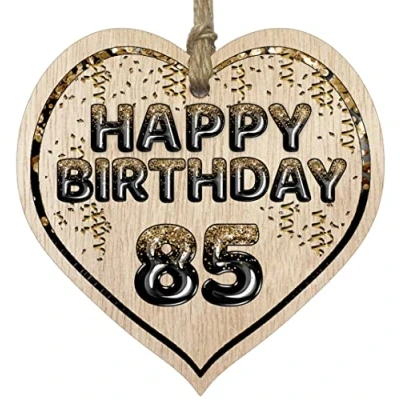 MAKE THEM SMILE WITH THIS BEAUTIFUL GIFT: This exceptional quality heart shaped wooden plaque shows the design: "Happy Birthday 85". If you are looking for funny thinking of you gifts for friends then then this hanging wooden heart is bound to make them smile. Not just for a women's 85th birthday presents also for men 85th birthday gifts for women friend. EVERY HEART IS TRUELY UNIQUE: Unlike other brands our beautiful plaques are made from raw wood and not a laminated MDF. This means that every single heart will have it's own pattern and indentation from the grain of the wood used. Each heart is hand finished with a lacquer varnish that really accentuates the the deep colour of the wood and also makes the ink of the pattern/text clearer and brighter in colour. WHAT DO YOU GET: This thoughtful presents for women is made from the highest quality wooden signs and plaques. Incredibly sweet cheer up positivity keepsake gifts for women and men from Stuff4 Ltd. MADE AND QUALITY CHECKED IN THE UK: We manufacture all our product right her in the UK so you can be sure of a fast turnaround and a product that is expertly made - mental health gifts, special friend gifts, miss you gifts for friends, positive gifts for women and birthday gifts for her or him. EASY TO HANG: The hanging wooden heart plaque comes equipped with a small jute twine, which can be then used to hang it on somewhere for decoration. The wooden sign is convenient for you to assemble without spending too much effort and time.