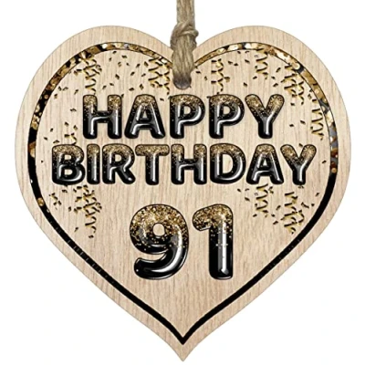 MAKE THEM SMILE WITH THIS BEAUTIFUL GIFT: This exceptional quality heart shaped wooden plaque shows the design: "Happy Birthday 91". If you are looking for funny thinking of you gifts for friends then then this hanging wooden heart is bound to make them smile. Not just for a women's 91st birthday presents also for men 91st birthday gifts for women friend. EVERY HEART IS TRUELY UNIQUE: Unlike other brands our beautiful plaques are made from raw wood and not a laminated MDF. This means that every single heart will have it's own pattern and indentation from the grain of the wood used. Each heart is hand finished with a lacquer varnish that really accentuates the the deep colour of the wood and also makes the ink of the pattern/text clearer and brighter in colour. WHAT DO YOU GET: This thoughtful presents for women is made from the highest quality wooden signs and plaques. Incredibly sweet cheer up positivity keepsake gifts for women and men from Stuff4 Ltd. MADE AND QUALITY CHECKED IN THE UK: We manufacture all our product right her in the UK so you can be sure of a fast turnaround and a product that is expertly made - mental health gifts, special friend gifts, miss you gifts for friends, positive gifts for women and birthday gifts for her or him. EASY TO HANG: The hanging wooden heart plaque comes equipped with a small jute twine, which can be then used to hang it on somewhere for decoration. The wooden sign is convenient for you to assemble without spending too much effort and time.