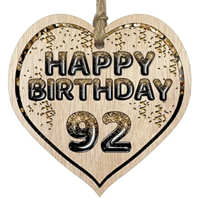 MAKE THEM SMILE WITH THIS BEAUTIFUL GIFT: This exceptional quality heart shaped wooden plaque shows the design: "Happy Birthday 92". If you are looking for funny thinking of you gifts for friends then then this hanging wooden heart is bound to make them smile. Not just for a women's 92nd birthday presents also for men 92nd birthday gifts for women friend. EVERY HEART IS TRUELY UNIQUE: Unlike other brands our beautiful plaques are made from raw wood and not a laminated MDF. This means that every single heart will have it's own pattern and indentation from the grain of the wood used. Each heart is hand finished with a lacquer varnish that really accentuates the the deep colour of the wood and also makes the ink of the pattern/text clearer and brighter in colour. WHAT DO YOU GET: This thoughtful presents for women is made from the highest quality wooden signs and plaques. Incredibly sweet cheer up positivity keepsake gifts for women and men from Stuff4 Ltd. MADE AND QUALITY CHECKED IN THE UK: We manufacture all our product right her in the UK so you can be sure of a fast turnaround and a product that is expertly made - mental health gifts, special friend gifts, miss you gifts for friends, positive gifts for women and birthday gifts for her or him. EASY TO HANG: The hanging wooden heart plaque comes equipped with a small jute twine, which can be then used to hang it on somewhere for decoration. The wooden sign is convenient for you to assemble without spending too much effort and time.