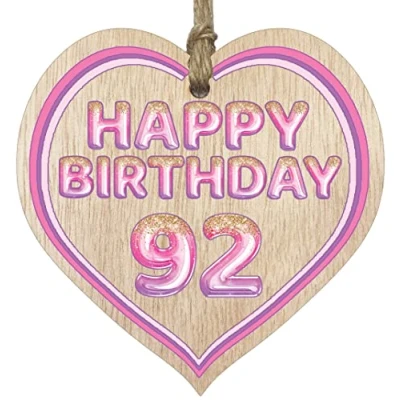 MAKE THEM SMILE WITH THIS BEAUTIFUL GIFT: This exceptional quality heart shaped wooden plaque shows the design: "Happy Birthday 92". If you are looking for funny thinking of you gifts for friends then then this hanging wooden heart is bound to make them smile. Not just for a women's 92nd birthday presents also for men 92nd birthday gifts for women friend. EVERY HEART IS TRUELY UNIQUE: Unlike other brands our beautiful plaques are made from raw wood and not a laminated MDF. This means that every single heart will have it's own pattern and indentation from the grain of the wood used. Each heart is hand finished with a lacquer varnish that really accentuates the the deep colour of the wood and also makes the ink of the pattern/text clearer and brighter in colour. WHAT DO YOU GET: This thoughtful presents for women is made from the highest quality wooden signs and plaques. Incredibly sweet cheer up positivity keepsake gifts for women and men from Stuff4 Ltd. MADE AND QUALITY CHECKED IN THE UK: We manufacture all our product right her in the UK so you can be sure of a fast turnaround and a product that is expertly made - mental health gifts, special friend gifts, miss you gifts for friends, positive gifts for women and birthday gifts for her or him. EASY TO HANG: The hanging wooden heart plaque comes equipped with a small jute twine, which can be then used to hang it on somewhere for decoration. The wooden sign is convenient for you to assemble without spending too much effort and time.