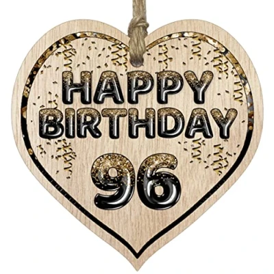 MAKE THEM SMILE WITH THIS BEAUTIFUL GIFT: This exceptional quality heart shaped wooden plaque shows the design: "Happy Birthday 96". If you are looking for funny thinking of you gifts for friends then then this hanging wooden heart is bound to make them smile. Not just for a women's 96th birthday presents also for men 96th birthday gifts for women friend. EVERY HEART IS TRUELY UNIQUE: Unlike other brands our beautiful plaques are made from raw wood and not a laminated MDF. This means that every single heart will have it's own pattern and indentation from the grain of the wood used. Each heart is hand finished with a lacquer varnish that really accentuates the the deep colour of the wood and also makes the ink of the pattern/text clearer and brighter in colour. WHAT DO YOU GET: This thoughtful presents for women is made from the highest quality wooden signs and plaques. Incredibly sweet cheer up positivity keepsake gifts for women and men from Stuff4 Ltd. MADE AND QUALITY CHECKED IN THE UK: We manufacture all our product right her in the UK so you can be sure of a fast turnaround and a product that is expertly made - mental health gifts, special friend gifts, miss you gifts for friends, positive gifts for women and birthday gifts for her or him. EASY TO HANG: The hanging wooden heart plaque comes equipped with a small jute twine, which can be then used to hang it on somewhere for decoration. The wooden sign is convenient for you to assemble without spending too much effort and time.