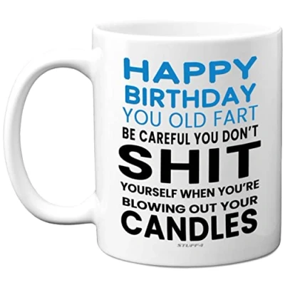 MAKE HIM LAUGH ON HIS SPECIAL DAY: If you are looking for the perfect Fathers Day gift for Dad from Daughter or Son then look no further. This exceptional quality mug bears the wording - "Happy Birthday You Old Fart Be Careful You Don't Shit Yourself When You're Blowing Out Your Candles" - Use for all occasions such as Father's Day, Birthdays, Christmas or at any point to show your appreciation. Not just for friendship gifts for men this could also be for Best Friend, Dad, Grandad, Colleague or WHAT DO YOU GET: This novelty mug for him is made from the highest quality mugs available on the market. An 11oz ceramic gloss finished mug with a large handle for ease of use. The cheeky design is printed on both sides so no one will miss it. Incredibly funny and thoughtful gifts for women and men from Stuff4 Ltd. PACKED FOR PROTECTION: Every order is packed in a drop proof double walled cardboard Mug Mailer which are lightweight and strong enough to provide total protection. So have the birthday boy in pieces and not the rude mugs, daddy birthday gifts. MADE AND QUALITY CHECKED IN THE UK: We manufacture all our product right her in the UK so you can be sure of a fast turnaround and a product that is expertly made - for his birthday gifts. 11oz DISHWASHER AND MICROWAVE SAFE MUGS: Made from premium ceramic our 11oz heavyweight mugs are manufactured with a dishwasher safe premium coating. This means that the colours of your image will not fade from even after multiple cycles (up to 800) through a dishwasher. They are also microwave safe.