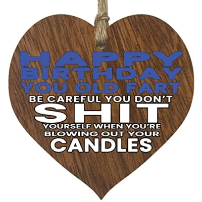 A LITTLE SOMETHING TO MAKE DAD SMILE: These exceptional quality heart shaped wooden plaque is one of the best Dad gifts on the market. A great dad gift that shows the wording: Happy Birthday You Old Fart Be Careful You Don't Shit Yourself When You're Blowing Out Your Candles. If you are looking for funny dad gifts then then this hanging wooden decoration is bound to make them smile. EVERY HEART IS TRUELY UNIQUE: Unlike other brands our beautiful plaques are made from raw wood and not a laminated MDF. This means that every single heart will have it's own pattern and indentation from the grain of the wood used. Each heart is hand finished with a lacquer varnish that really accentuates the deep colour of the wood and also makes the ink of the pattern/text clearer and brighter in colour. WHAT DO YOU GET: This dad gift is made from the highest quality wooden signs and plaques. Tell dad how wonderful they are on their Birthday, Valentines, Christmas, or any time say something out of love. It can be used to hang round prosecco, champagne, wine & spirits gifts. Versatile and well-made personalised gifts for men from Stuff4 Ltd. MADE AND QUALITY CHECKED IN THE UK: We manufacture all our products right her in the UK so you can be sure of a fast turnaround and a product that is expertly made - some things i still can't tell you poems. We have the perfect dad gifts available on Amazon. EASY TO HANG: The hanging wooden heart plaque comes equipped with a small jute twine, which can be then used to hang it on somewhere for decoration. The wooden sign is convenient for you to assemble without spending your too much effort and time.