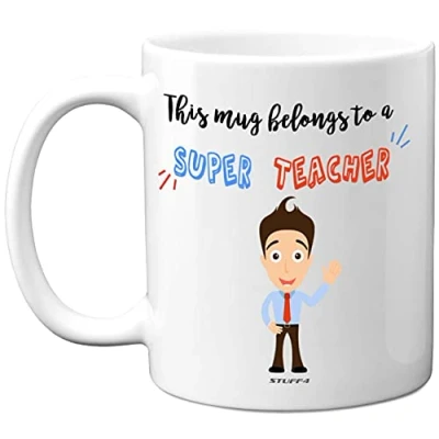 MAKE THEM GIGGLE AT SCHOOL: If you are looking for teacher gifts for women and men then look no further. This exceptional quality mug bears the wording - This Mug Belong's To A Super Teacher - It's bound to make them smile. Not just for a new teacher gifts, this mug could also be used for nursery leaving gifts or just gifts for teachers in general. WHAT DO YOU GET: This teacher gifts for men or women is made from the highest quality mugs on the market. An 11oz ceramic gloss finished mug with a large handle for ease of use. The charming design is printed on both sides so no one will miss it. Incredibly funny and thoughtful gifts for women and men from Stuff4 Ltd. Nursery teacher gifts, present for teachers female PACKED FOR PROTECTION: Every order is packed in a drop proof double walled cardboard Mug Mailer which are lightweight and strong enough to provide total protection. So have the special teacher in pieces rather than the mugs. Give the best teacher mug this year. Nursery teacher thank you gifts, gift for teacher, teachers presents and more. MADE AND QUALITY CHECKED IN THE UK: We manufacture all our products right here in the UK so you can be sure of a fast turnaround and a product that is expertly made - for her and him teaching gifts, teacher mugs for women, teacher presents for men, gifts for male teachers, thank you nursery teacher gifts 11oz DISHWASHER AND MICROWAVE SAFE MUGS: Made from premium ceramic our 11oz heavyweight mugs are manufactured with a dishwasher safe premium coating. This means that the colours of your image will not fade even after multiple cycles (up to 800) through a dishwasher. They are also microwave safe. nursery gifts for teachers, newly qualified teacher gifts, teaching assistant mug, teachers gifts, mugs for teachers