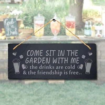 Stukk Come Sit Friendship Hanging Garden Sign, Natural Engraved Slate Stone Plaque, 30x12cm