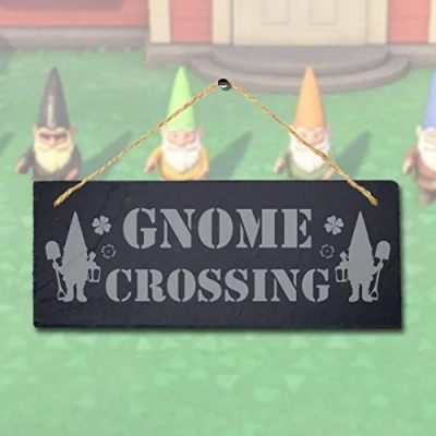 Stukk Gnomes Crossing Laser Hanging Garden Home Decor Sign, Natural Engraved Slate Stone Plaque, 30x12cm