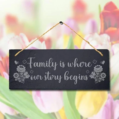 Stukk Laser Hanging Forever Love Greatest Gift Sign (Family is Where Our Story Begin), Natural Engraved Slate Stone Plaque, 30x12cm (Large)