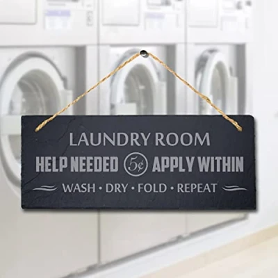 Stukk Laundry Room Help Needed Apply Within Laser Hanging Sign, Natural Engraved Slate Stone Plaque, 30x12cm