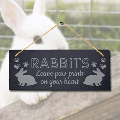 Stukk Leave Paw Prints On Your Heart Hanging Rabbit Bunny Sign, Natural Engraved Slate Stone Plaque, 30x12cm