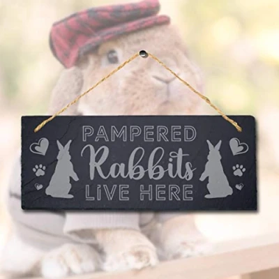 Stukk Pampered Live Here Laser Hanging Rabbit Bunny Sign, Natural Engraved Slate Stone Plaque, 30x12cm