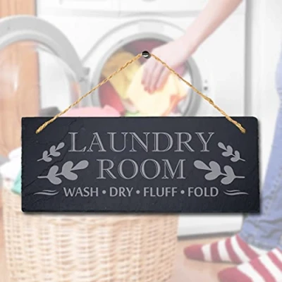 Stukk Room Wash Dry Fold Laser Hanging Laundry Hub Sign, Natural Engraved Slate Stone Plaque, 30x12cm