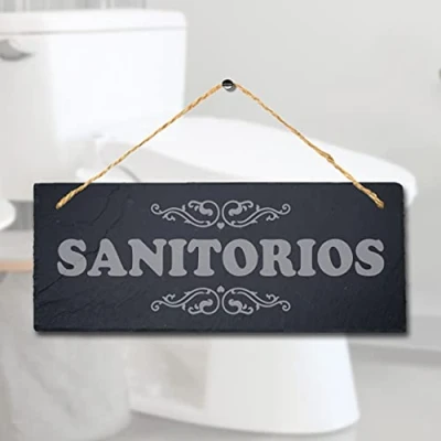 Stukk Sanitorios Laser Hanging Washroom Bath Toilet Home Sign, Natural Engraved Slate Stone Plaque, 30x12cm