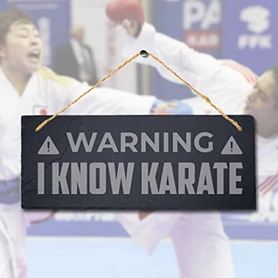 Stukk Warning I Know Karate Laser Hanging Fighters Home Sign, Natural Engraved Slate Stone Plaque, 30x12cm (Large)