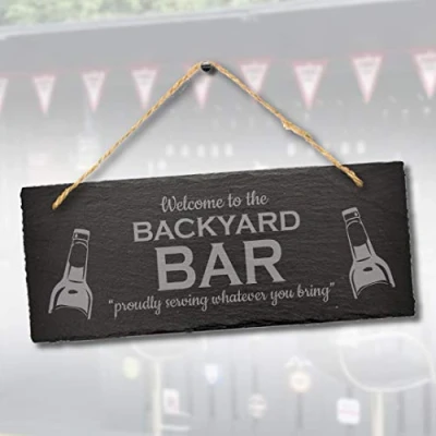 Stukk Welcome to The Backyard Hanging Bar Mancave Shed Sign, Natural Engraved Slate Stone Plaque, 30x12cm