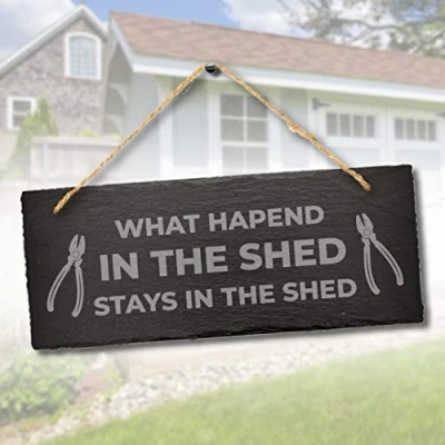 Stukk What Happened in This Shed Stay Humorous Hanging, Natural Engraved Slate Stone Plaque, 30x12cm
