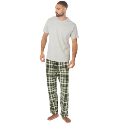 Style It Up Mens Short Sleeve Pyjama Set Cotton Top Brushed Fleece Bottoms PJ Loungewear/Nightwear (GREY KHAKI, M)