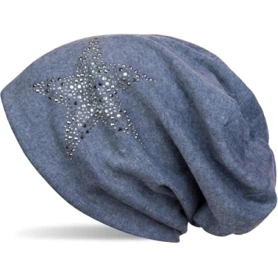 styleBREAKER Beanie hat with Rhinestone Rivets Star and Silver Anthracite Coloured Decorative Stones, Slouchy Long Beanie, Unisex 04024087, Colour:Mottled Denim Blue