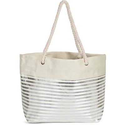 Large beach handbag for the whole family with shiny metallic stripes Dimensions bag: approx. 58 x 38 x 20 cm / Length rope handle: approx. 76 cm 1 main compartment with zip 1 small side pocket inside, e.g. for mobile phones The bag can also be used as a swimming or shopping bag