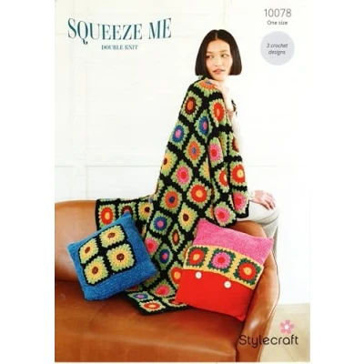 Please note. This is an instructional crochet pattern pamphlet, not the garments shown. Size Range : Large Blanket 132cm x 154cm. Square Cushion 42cm square. Stripped Cushion : 39cm x 42cm 3 Crochet Designs Crochet Hook Required 4mm & 4.5cm Example crocheted in Stylecraft Squeeze Me Double Knit