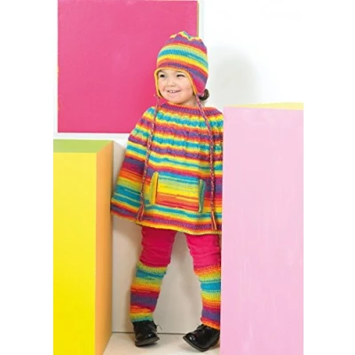 Stylecraft Merry Go Round DK Knitting Pattern 8741: Knit a charming and colourful children's set including a cape, leg warmers, and a helmet, perfect for playful adventures and using the vibrant self-striping Stylecraft Merry Go Round DK yarn.