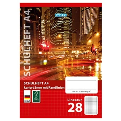 25 exercise books in DIN A4 format, each with 16 sheets Paper with a thickness of 80 g/m² Line style 28 - squared, with 5 mm margins inside and outside Ideal for preschool and school FSC mix - made from sustainable wood cultivation, made in Germany, Manufacturer: Stylex