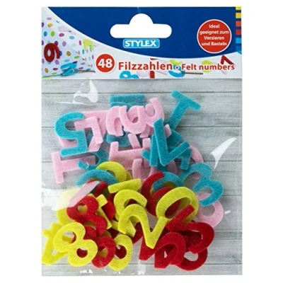 Felt numbers for crafting and decorating Contents: 48 pieces Assorted colours For decorating crafts, for designing greeting cards and invitations or as a table decoration for school enrolment, Manufacturer: Stylex