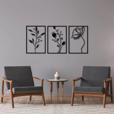 Crafted from 100% durable metal with a thickness of 1.5 mm, ensuring long-lasting quality and a sleek appearance. Eye-catching decorative wall accessory featuring a modern design, perfect for enhancing any living space or office decor. Generously sized at 49 x 70 cm, this three-piece set creates a stunning focal point on your wall, adding depth and style. Easy to hang and install, making it a hassle-free addition to your home or workspace. Elegant black color complements a variety of interior styles, from contemporary to industrial, making it a versatile choice for any room.