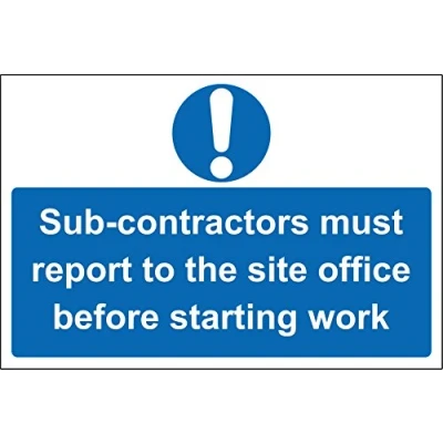 Sub-contractors must report to the site office before starting work Safety sign 3mm Aluminium sign 300mm x 200mm Digitally printed and laminated for extra durability 10mm Radius rounded corners, no sharp edges, Manufacturer: KPCM Display