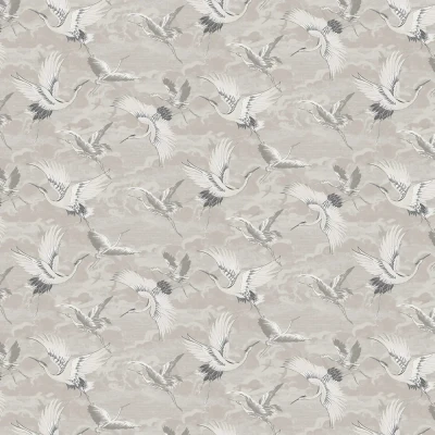 A lightly textured wallcovering with lustre detail. Large scale cranes in flight against a cloudy sky with swallows in silhouette. Shown in the Neutral colourway of grey, white and cream.