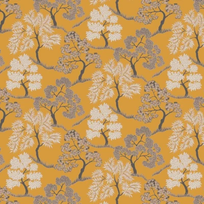 A very lightly textured wallcovering with lustre details. An imaginary landscape of decorative bonsai-like trees. Shown in the Ochre yellow colourway.