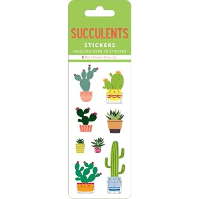 Smiling succulents make adorable stickers, and you'll find more than 50 in this fun sticker sheet set! Stickers include cute container cacti, aloe plants, jade, hens-and-chicks, and many more. Irresistible, decorative designs add personality wherever they stick! Set contains over 50 stickers. Premium stickers have a high-quality finish. Stickers peel off backing sheets easily. Adhesive adheres securely to paper and other surfaces. Set comes with 6 sheets of stickers. Each sheet measures 2-1/2'' x 7-1/8''. Sticker set comes in a protective polybag.