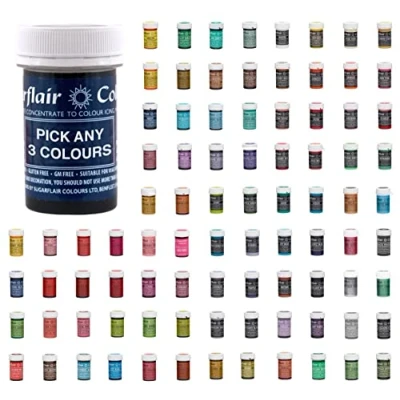 Choose from 80+ Sugarflair Food Colours Fabulous Sugarflair Paste Colours; Highly concentrated food colouring Can be added or kneaded into sugar paste, fondant, buttercream, royal icing, marzipan, flower & modelling paste, pastry and salt dough etc Nut Free, Gluten Free, GM Free Suitable for Vegetarians and Vegans Pick and Mix any 3 Colours
