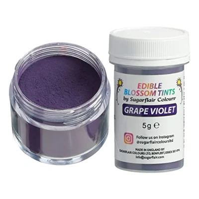 Grape Violet Food Colouring Powder - Sugarflair Blossom Tint is a versatile Food Colouring and Dusting Powder. These powders can be mixed into Sugarpaste, Buttercream, Royal Icing, Chocolate, Batters, Macarons and more to give a bright and vibrant finish or dusted onto cake decorations and surfaces. 100% Edible Food Colouring Powder - All products in the Sugarflair Colours Blossom Tint food colouring dust range are completely edible and can be used to colour cake decorations, bakes, icing, pastes and chocolate Create Unique Special Occasion Cakes - Every birthday, anniversary or other special occasion calls for a special cake. Create unique designs with this edible blossom tints from Sugarflair Colours. Extensive Range of over 50 Unique Colours - Add colour to your cakes and bakes with this concentrated food colouring dust from Sugarflair which comes in many brilliant colours including Black, Blush Pink, Brown, Foliage Green, Lemon Yellow, Old Gold & White, sure to match your cake theme. Nut Free, Gluten Free, GM Free. Not Suitable for Vegetarians and Vegans
