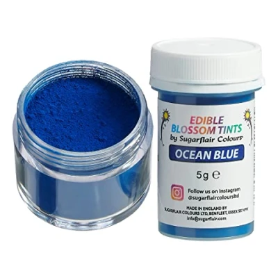 Ocean Blue Food Colouring Powder - Sugarflair Blossom Tint is a versatile Food Colouring and Dusting Powder. These powders can be mixed into Sugarpaste, Buttercream, Royal Icing, Chocolate, Batters, Macarons and more to give a bright and vibrant finish or dusted onto cake decorations and surfaces. 100% Edible Food Colouring Powder - All products in the Sugarflair Colours Blossom Tint food colouring dust range are completely edible and can be used to colour cake decorations, bakes, icing, pastes and chocolate Create Unique Special Occasion Cakes - Every birthday, anniversary or other special occasion calls for a special cake. Create unique designs with this edible blossom tints from Sugarflair Colours. Extensive Range of over 50 Unique Colours - Add colour to your cakes and bakes with this concentrated food colouring dust from Sugarflair which comes in many brilliant colours including Black, Blush Pink, Brown, Foliage Green, Lemon Yellow, Old Gold & White, sure to match your cake theme. Nut Free, Gluten Free, GM Free, Kosher. Suitable for Vegetarians and Vegans