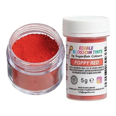 Poppy Red Food Colouring Powder - Sugarflair Blossom Tint is a versatile Food Colouring and Dusting Powder. These powders can be mixed into Sugarpaste, Buttercream, Royal Icing, Chocolate, Batters, Macarons and more to give a bright and vibrant finish or dusted onto cake decorations and surfaces. 100% Edible Food Colouring Powder - All products in the Sugarflair Colours Blossom Tint food colouring dust range are completely edible and can be used to colour cake decorations, bakes, icing, pastes and chocolate Create Unique Special Occasion Cakes - Every birthday, anniversary or other special occasion calls for a special cake. Create unique designs with this edible blossom tints from Sugarflair Colours. Extensive Range of over 50 Unique Colours - Add colour to your cakes and bakes with this concentrated food colouring dust from Sugarflair which comes in many brilliant colours including Black, Blush Pink, Brown, Foliage Green, Lemon Yellow, Old Gold & White, sure to match your cake theme. Nut Free, Gluten Free, GM Free, Kosher. Suitable for Vegetarians and Vegans