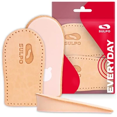 HELPS AGAINST PAIN: SULPO heel lift cushions with shock absorption properties provide the wearer with exceptional support and can help reduce heel spur and Achilles tendon pain. BETTER THAN GEL CUSHIONS: SULPO heel wedge is made of high quality materials. The underside is made of moulded foam, the top is made of strong natural leather. This construction provides stability - perfect for heel elevation and also for those who need extra cushioning. PERFECT FIT: Our heel wedges fit your feet perfectly. Whether you need to even out leg length, increase comfort or grow taller - our range is perfectly tailored. Choose the height and size and enjoy the boost that these soles bring. EUROPEAN QUALITY: High-quality materials and handcrafted workmanship in the EU give these insoles exceptional durability so that you can enjoy them for many months. FOR MOST SHOE TYPES: SULPO heel wedge can be worn in most shoe models with closed heels, such as running shoes, sports shoes, stylish shoes and boots. Small stickers on the underside ensure that the insoles do not slip in the shoe.
