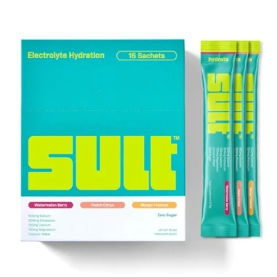 đĽđđŁđđ đđŹđđĽđđ§đđ˘đĄ & đđđđđ§đĽđ˘đđŹđ§đ đđđđđĄđđ - SULT electrolyte powder replenishes essential minerals for energy, focus, skin health and muscle function. Formulated with 6 key electrolytes to support hydration during exercise, long work days, travel or daily living. đđđĽđ˘ đŚđ¨đđđĽ, đđđĽđ˘ đđđđ˘đĽđđđŚ â đđđđđĄ đđ˘đĽđ đ¨đđ - No sugar, no artificial sweeteners, no artificial colours or bulking agents. Naturally sweetened with stevia and flavoured with natural fruit extracts. Suitable for keto, fasting, low-carb and diabetic-friendly lifestyles. đđŠđđĽđŹđđđŹ đ˘đŁđ§đđ đđŚđđ đđđđđ§đĽđ˘đđŹđ§đ đĽđđ§đđ˘ - Each sachet delivers 500mg Sodium, 304mg Potassium, 100mg Magnesium and 120mg Calcium, supporting muscle function, nerve signalling, electrolyte balance and reduced fatigue during training, travel and hot climates. đŁđđđĄđ§-đđđŚđđ, đĄđ˘đĄ-đđ đ˘ & đđđđđŚđ§đđŠđ đđĽđđđĄđđđŹ - Made using Pink Himalayan Salt, Coconut Water Powder, Magnesium Citrate, Calcium Citrate Malate and Dipotassium Phosphate for efficient absorption. Vegan, gluten-free, non-GMO and plant-based for cleaner daily hydration. đĽđđđĽđđŚđđđĄđ đđĽđ¨đđ§ đđđđŠđ˘đ¨đĽđŚ + đ˘đĄ-đ§đđ-đđ˘ đŚđđđđđ§đŚ - Available in Peach Citrus, Watermelon Berry, Mango Tropical and Variety Packs. Single-serve sachets dissolve instantly in cold water - ideal for gyms, commutes, travel, flights, sports, hangovers, fasting, general hydration and everyday wellness. đđ˘đŞ đ§đ˘ đ§đđđ - Mix 1 sachet of SULT with 500mlâ1L of water. Drink before training, during long days or anytime hydration drops. For extended activity or hot conditions, a second sachet can be used to replace electrolytes lost through sweat. No scoops, no mess, just single-serve, travel-ready sachets with a perfectly balanced dose.