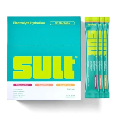 đĽđđŁđđ đđŹđđĽđđ§đđ˘đĄ & đđđđđ§đĽđ˘đđŹđ§đ đđđđđĄđđ - SULT electrolyte powder replenishes essential minerals for energy, focus, skin health and muscle function. Formulated with 6 key electrolytes to support hydration during exercise, long work days, travel or daily living. đđđĽđ˘ đŚđ¨đđđĽ, đđđĽđ˘ đđđđ˘đĽđđđŚ â đđđđđĄ đđ˘đĽđ đ¨đđ - No sugar, no artificial sweeteners, no artificial colours or bulking agents. Naturally sweetened with stevia and flavoured with natural fruit extracts. Suitable for keto, fasting, low-carb and diabetic-friendly lifestyles. đđŠđđĽđŹđđđŹ đ˘đŁđ§đđ đđŚđđ đđđđđ§đĽđ˘đđŹđ§đ đĽđđ§đđ˘ - Each sachet delivers 500mg Sodium, 304mg Potassium, 100mg Magnesium and 120mg Calcium, supporting muscle function, nerve signalling, electrolyte balance and reduced fatigue during training, travel and hot climates. đŁđđđĄđ§-đđđŚđđ, đĄđ˘đĄ-đđ đ˘ & đđđđđŚđ§đđŠđ đđĽđđđĄđđđŹ - Made using Pink Himalayan Salt, Coconut Water Powder, Magnesium Citrate, Calcium Citrate Malate and Dipotassium Phosphate for efficient absorption. Vegan, gluten-free, non-GMO and plant-based for cleaner daily hydration. đĽđđđĽđđŚđđđĄđ đđĽđ¨đđ§ đđđđŠđ˘đ¨đĽđŚ + đ˘đĄ-đ§đđ-đđ˘ đŚđđđđđ§đŚ - Available in Peach Citrus, Watermelon Berry, Mango Tropical and Variety Packs. Single-serve sachets dissolve instantly in cold water - ideal for gyms, commutes, travel, flights, sports, hangovers, fasting, general hydration and everyday wellness. đđ˘đŞ đ§đ˘ đ§đđđ - Mix 1 sachet of SULT with 500mlâ1L of water. Drink before training, during long days or anytime hydration drops. For extended activity or hot conditions, a second sachet can be used to replace electrolytes lost through sweat. No scoops, no mess, just single-serve, travel-ready sachets with a perfectly balanced dose.