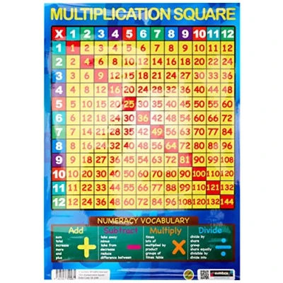Multi colour Multiplication Square Times tables from 1 to 12 Numeracy vocabulary Aids learning process Professionally printed and laminated Paper finish: glossy