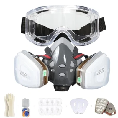 Full protection: worry-free protection. The Sumeber gas mask (full mask) has been developed for the most demanding users. Fully equipped, includes the respirator device, 10 cotton filters, 2 cartridges, 2 cartridge covers, 1 pair of gloves and 1 instruction manual (English language not guaranteed). Double filtration (A1P2): Our respirator mask with filter has a double filter system of class A1P2 to ensure your protection against gases, vapours and particles. The anti-gas cartridges filter organic gases and vapors with boiling points above 65°C. The P2 dust filter filters at least 94% of the particles in the air. Compatible with RD40 filter interface. Durability: The body of the Sumeber dust mask is made of high-quality materials. The face mask of this respirator mask is made of airtight silicone sealing material, which completely protects you from dust and gases. The frame of this respirator is made of robust ABS material and the polycarbonate visor provides strength and impact and chemical resistance, which increases the life of the masks. Wide range of uses: Thanks to the high protection, ideal for painting work (spray and elastomer), dust, epoxy resin, polishing, grinding, welding, chemical and laboratory work and much more. Don't worry about breathing safety, we already do it for you. Visibility and communication: this full face filter mask offers a wide field of view thanks to the low filter profile and a scratch-resistant anti-fog glass, which offers a best possible viewing angle of 76° during work. The speech membrane installed in this respirator with filter allows uninterrupted and easy communication during operation.