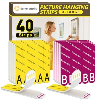 A+B Hanging Adhesive Strips: Our Picture hanging strips (20 pairs/40 strips), which can be used instead of nails or liquid adhesive to avoid problems with holes, glue residue and marks, and keep the wall beautiful. The combination A (Hook)+B (Loop) can be attached or detached repeatedly, making it easy to move and adjust. Easy to Use: Summerbrite wall hanging strips can attach picture frames, decorative paintings, billboards, wall clocks, mirrors, shelves, decorations, rugs, and other items without the need for nails, screws, hammers, and other tools. Our wall stickers for picture hanging is suitable for various smooth surfaces, such as painted walls, ceramic tile, glass, metal, plastic, and wooden doors. Damage Free Hanging: The foam glue is stretchy. Simply press the top of the band and then pull the band vertically in the direction of the mark. The adhesive of the double sided tape strength will gradually disappear without damaging the surface and the strips can be removed with ease. The surface will remain clean, free of residue. Heavy Duty Adhesive Tape: The size of the extra wide picture hanging adhesive strip (XL) is 10cm x 2cm to fit more scenes. 4 pairs of bands can support a maximum weight of 6.8kg. The sealing level of the adhesive backing is IPX7, and the temperature of the working environment is -10°C to 65°C. Tips: Make sure the surface is smooth and dry before using, do not use it on wet, rough and porous surfaces; Do not hang valuables or dangerous items. increase the pressure time and force to make the bond safer and more stable; Make sure that the weight of hanging objects is within the tolerance range., Weight: 0.2866009406 pounds, Manufacturer: SummerBrite