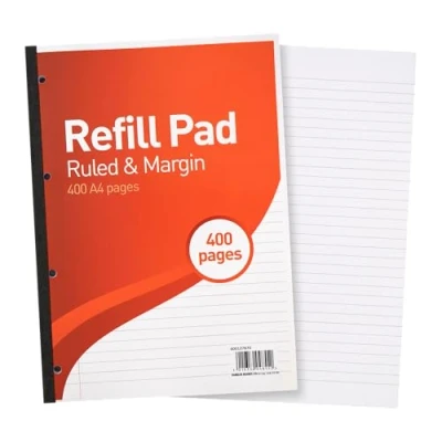 Size & Format: A4 refill pad with ruled paper and margin; for school, university or office use Page Count: Contains 400 lined pages to give you ample space for extensive note-taking or long coursework Layout: 8 mm ruled lines with pre-printed margin for neat, organised writing and easy readability Filing Ready: Four-hole punched for direct insertion into standard binders or lever-arch folders Versatile Use: Perfect for essays, lecture notes, meeting minutes or everyday writing tasks