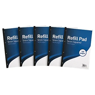 A4 Refill Pad, 5 mm Squared Punched with 4 holes: easily file away your notes 5 mm Squared, 70 gsm paper 160 pages per pad Pack of 5