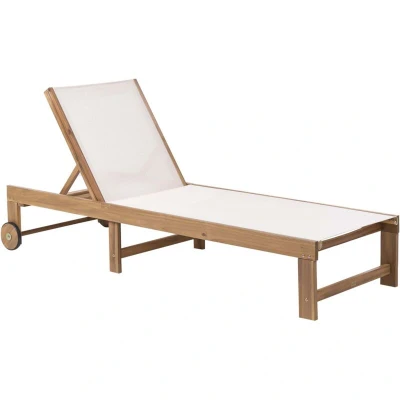 Garden Sunbed with Wheels. Experience the perfect blend of style and durability with this sun lounger, expertly constructed from certified acacia wood. The frame supports a comfortable and resilient seat made from high-quality textilene fabric, which is specifically designed to be UV resistant, ensuring the colours remain vibrant season after season. The lounger is fitted with two sturdy wheels for effortless movement and positioning around your garden, allowing you to chase the perfect patch of sun with ease. This chic piece of outdoor furniture promises a luxurious spot for relaxation for many years to come. Details: Product Type: Sun Lounger General Color: Brown, Beige Frame Colour: Light Brown Shade: Light Brown Material Type: Wood Main Material: Certified Acacia Wood Additional Material: Mesh Material Composition: 30% Polyester Adjustable Backrest: Yes Adjustable Parts: Backrest Armrests: No Finish: Oiled Foldable: No Dimensions: Depth: 192 cm Width: 66 cm Height: 33-85 cm